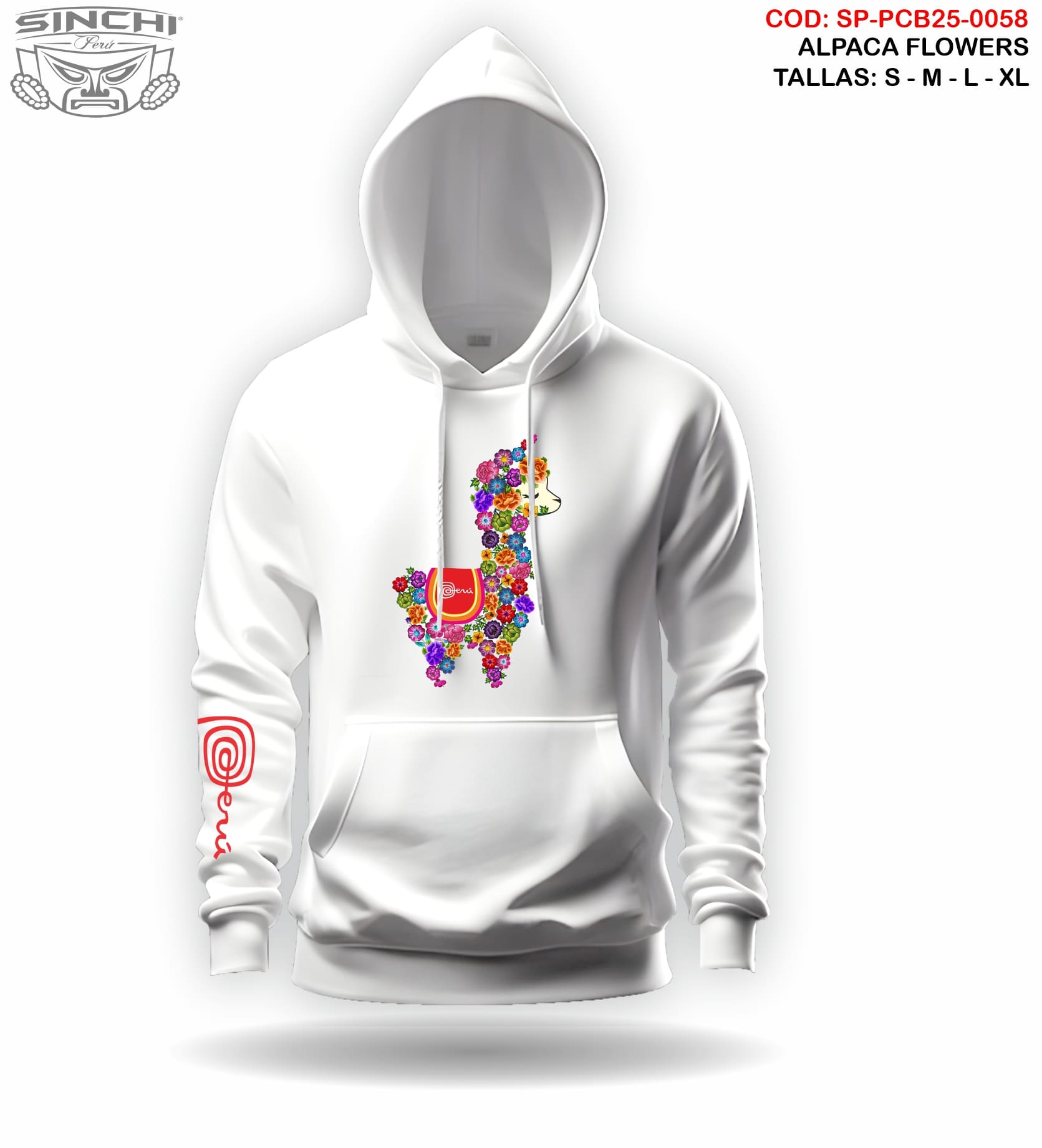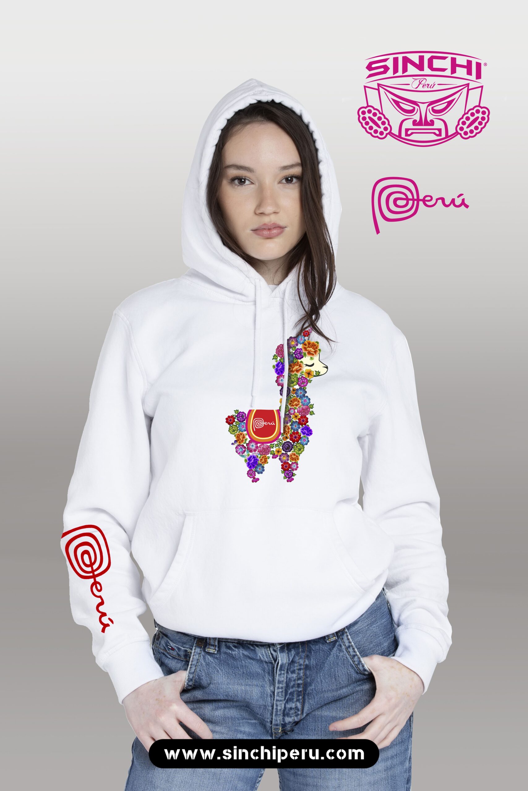 No te puedes equivocar con un clásico. La sudadera con capucha SINCHI PERÚ Alpaca flowers, que viene en colores blanco, perla, negro, azul marino, con el logotipo en el pecho y la manga, está confeccionada con tela afranelada 100% de algodón, colores reactivos, tiene un ajuste regular y un bolsillo estilo canguro.